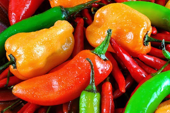 WatermelonNormally when you think of healthy foods that are good for you, first thing that comes to mind is that it probably tastes bad. Watermelon happens to be the opposite, it's a great tasting fruit that comes with big health benefits. One slice of watermelon has approximately 86 calories (depending on the size of the slice), 20 grams of carbohydrate, 2 grams of protein, less than a gram of fat, no cholesterol, very little sodium, and a decent amount of fiber which makes it one of the premier fat burning/weight loss foods. Watermelon also comes with high carotenoid content (needed for cardiovascular health and fighting cancers), Vitamin A & C (antioxidants that renders free radicals ineffective), beta-carotene, potassium, magnesium, pantothenic acids, and manganese. The high water content of this fruit is what makes it such an effective fat burning machine. The water, along with it's protein and fiber content, make your body work harder to process it, thus increasing your metabolism. For those of you that need to closely watch your sugar intake, Watermelon does come with about 16 grams of sugar, so if you have issues with sugar, this fruit should definitely be consumed in moderation.Colored Hot Peppers