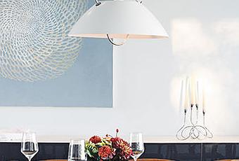 At the rural Ontario vacation house belonging to a pair of writers, a pendant lamp by Hans Wegner for Carl Hansen & Søn hangs above a custom dining table by Cabinet. The paint is Cloud White by Benjamin Moore, and the painting, titled Meshed, is by Anna Yuschuk. (We're suckers for the paper-yarn chairs.) Keep the palette neutral with white dinnerware to complement the wood table.
