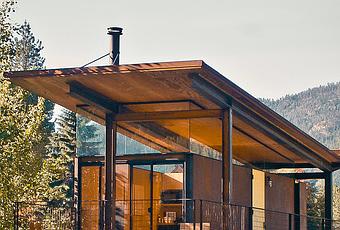 The steel-clad Rolling Huts designed by Olson Kundig Architects in Manzama, Washington, sit lightly on the land thanks to wheels that allow the tiny residences to "hover" above the site, optimizing views of the landscape. Photo by Derek Pirozzi.