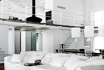 A 200-year-old factory in Umbria is transformed into an inviting home by designer Paola Navone. In the seating area, a trolley found at a flea market functions as the coffee table alongside an expansive Navone-designed sofa for Linteloo. Custom pendants by photographer Mark Eden Schooley hang above the dining table. Photo by Wichmann + Bendtsen.