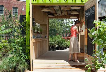 For this temporary welcome center at a summer farmer's market, Toronto-based firm Levitt Goodman Architects opted to go green, repurposing a shipping container for the structure.