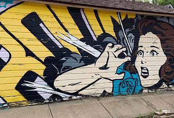 Who says that dogs cannot be man’s best friend? This skeletal depiction makes a deeper statement that maybe we are not all that different after all. Art for thought! This mural paints the outside of Moe’s Bodyworks which is a chiropractic health center for animals and humans.