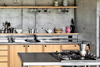 Three designers jump-start their practice with an affordably built abode in New Zealand. They fabricated everything in the house, down to the quarter-sawn pine and macrocarpa-wood kitchen cabinetry and concrete floor. “Physically the most challenging part of the build was wrestling an incredibly slippery concrete pump up the muddy driveway in the rain!” says designer Ben Mitchell-Anyon. The enamel pendant light is vintage. Photo by Paul McCredie.