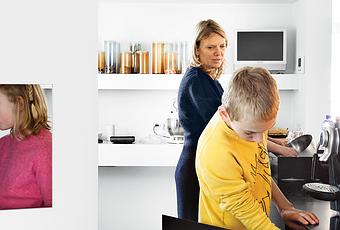 Black and white: Use the absence of color to calm the space. In a new house made in the shell of an old Belgian factory, Milan, Oona, and their mother putter in the spartan kitchen, which keeps the counter clear and necessities stored on nearby shelves. The simple palette keeps things from getting too busy.