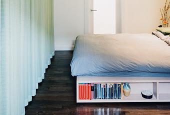 In a teeny, tiny San Francisco house tucked into the side of a hill, a curtain wall obscures the closet in the master bedroom, creating an instant sense of peace. A low horizontal shelf holds all necessities and grounds the space. Photo by Zubin Shroff.