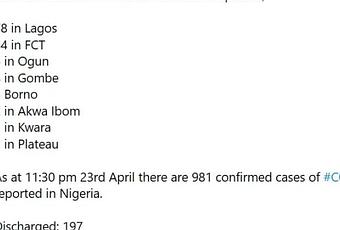As at 11:30 pm 23rd April, there are 981 confirmed cases of COVID-19 reported in Nigeria. Discharged: 197 Deaths: 31