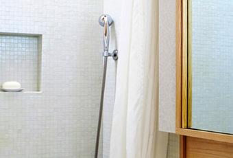 Faced with the challenge of a 240-square-foot New York apartment in desperate need of a refresh, architect Tim Seggerman went straight to his toolbox to craft a Nakashima-inspired interior. The architect brightens the limited space with warm wood and tiny tile. Photo by David Engelhardt.