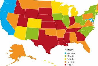 But the same cannot be said of the individual states. While some have respectable scores (those above in blue and green), others get poor to mediocre scores (those in yellow and orange), and too many get a failing grade (those in red on the map).
