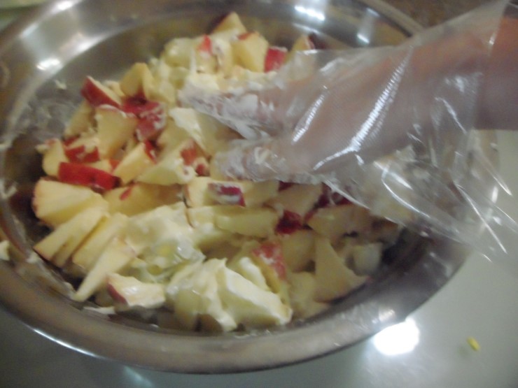 I prefer to use hands with gloves to make sure everything is mixed well.