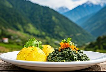 A traditional Uttarakhand meal served on a wooden table with a breathtaking mountain backdrop