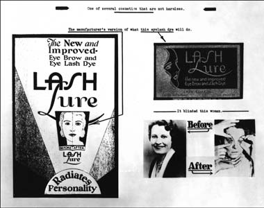 ... As the manufacturers of the largest-selling, best-known mascara in the world, Maybelline, an absolutely harmless, non-smarting eyelash darkener that contains no dye or aniline derivative, we have suffered untold damage to our old established business by the ambiguous publicity given out concerning the Tugwell bill. In a recent issue of the Paramount Newsreel, Professor Tugwell told a truly appalling tale of injuries caused by a poisonous preparation, but neglected to give its name as “Lash-Lure” or to state that it was a dye, merely calling it an eyelash "beautifier,” and concluding his speech with the dreadful remark, “This is the kind of stuff you women use on your eyelashes!”