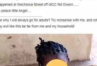 “What a wicked world? Somkenechukwu 2yrs old was strangled yesterday by their maid, a 16yr old girl because the little girl refused to wear her clothes after taking a bath….This happened at Ihechiowa Street off MCC Rd Owerri.
