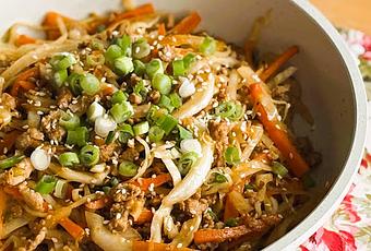 - Push the turkey mixture to the side of the pan. Add the sesame oil, carrots and cabbage.