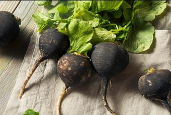 Dating back to the 16th century, these radishes, with spicy white flesh inside black skins, add flavor to cold storage dishes.