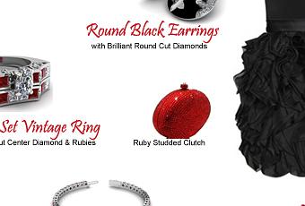 Let the look do the talking this New Year. The little black dress personified with the perfect accessories all set to make heads turn. Bring the dress to life with our gorgeous round black earrings coupled with a vintage ring and an eternity bracelet in diamonds and rubies. A dash of color with the ruby studded clutch and red stilettos to complete the look.
