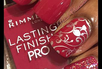 Rimmel Cherry Fashion is a cherry red creme with a great formula. It applies well, is opaque in two coats and dries very quickly. On my ring finger, I stamped an image from the Pueen 59 plate with A-England Excalibur. On my pinky, I added a coat of Mavala Sparkling Violet, a mixture of gold, purple and blue microglitters in a clear base. I topped the mani off with Seche Vite.