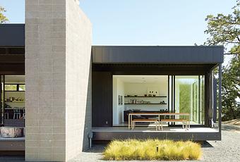 At this Marmol Radziner–designed prefab house in Northern California, an outdoor fireplace seamlessly integrates into a structural concrete block wall on the deck, adding to the structure's overall visual language.