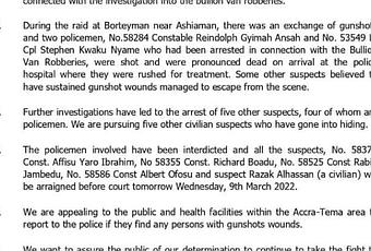 “During the raid at Borteyman, near Ashaiman, there was an exchange of gunshots and two policemen, No. 58284 Constable Reindolph Ansah and No. 53549 Lance Corporal Stephen Kwaku Name who had been arrested in connection with the Bullion Van Robberies, were shot and were pronounced dead on arrival at the Police Hospital where they were rushed for treatment. Some other suspects believed to have sustained gunshot wounds managed to escape the scene.”