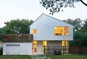 Through a series of split-levels, this previously one-story home in Massachusetts is now three-and-a-half levels, with much of the new square footage reaching into the backyard. The asymmetrical angle of the roof’s pitch isn’t architectural whimsy. Instead, it simultaneously hides an array of solar panels from view while optimizing its angle to the sun.