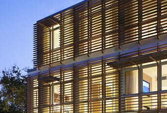 Stephen Yablon Architect added on a striking modern pavilion to a traditional beach house in Sullivan's Island, South Carolina. The ipe-wood louvered addition is only 15 and a half feet wide. Photo by Michael Moran.