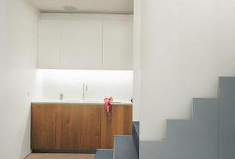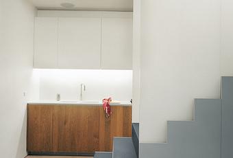 The staircase in Brad Smith and Brian Brennan’s compact former coach house, tucked away in one of London’s many hidden cobbled mews, acts as both room divider and main storage. The stair “carpet” is made from the same tough rubber that is used to make tires for semis. Photo by Peter Marlow.