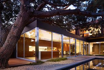 When designing a low-maintenance home for his parents in Venice, California, Daniel Monti took inspiration from a massive stone pine tree that dominated the location, never considering removing it despite the challenges it presented. The tree's canopy stretches over the first floor of the home, and can be glimpsed from the multiple skylights that are placed strategically above the living area.