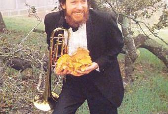 Here we have a bearded man, a wonderfully bearded man, wearing a tuxedo, holding in his hands both a plentiful bounty of mushrooms as well as a brass trumpet.