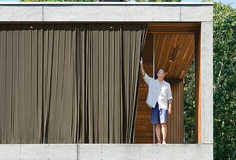 Decades after they met as teenagers on a Montauk beach, Manhattanites Victoria and Greg Pryor returned to Long Island to build a sustainable second home together. Two layers of aluminum woven-coil drapes hang outside the large, south-facing windows above the living area.