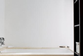 In the master bath, a Zuma tub with Hansgrohe fixtures is covered with limestone tile to soak up the sunshine.