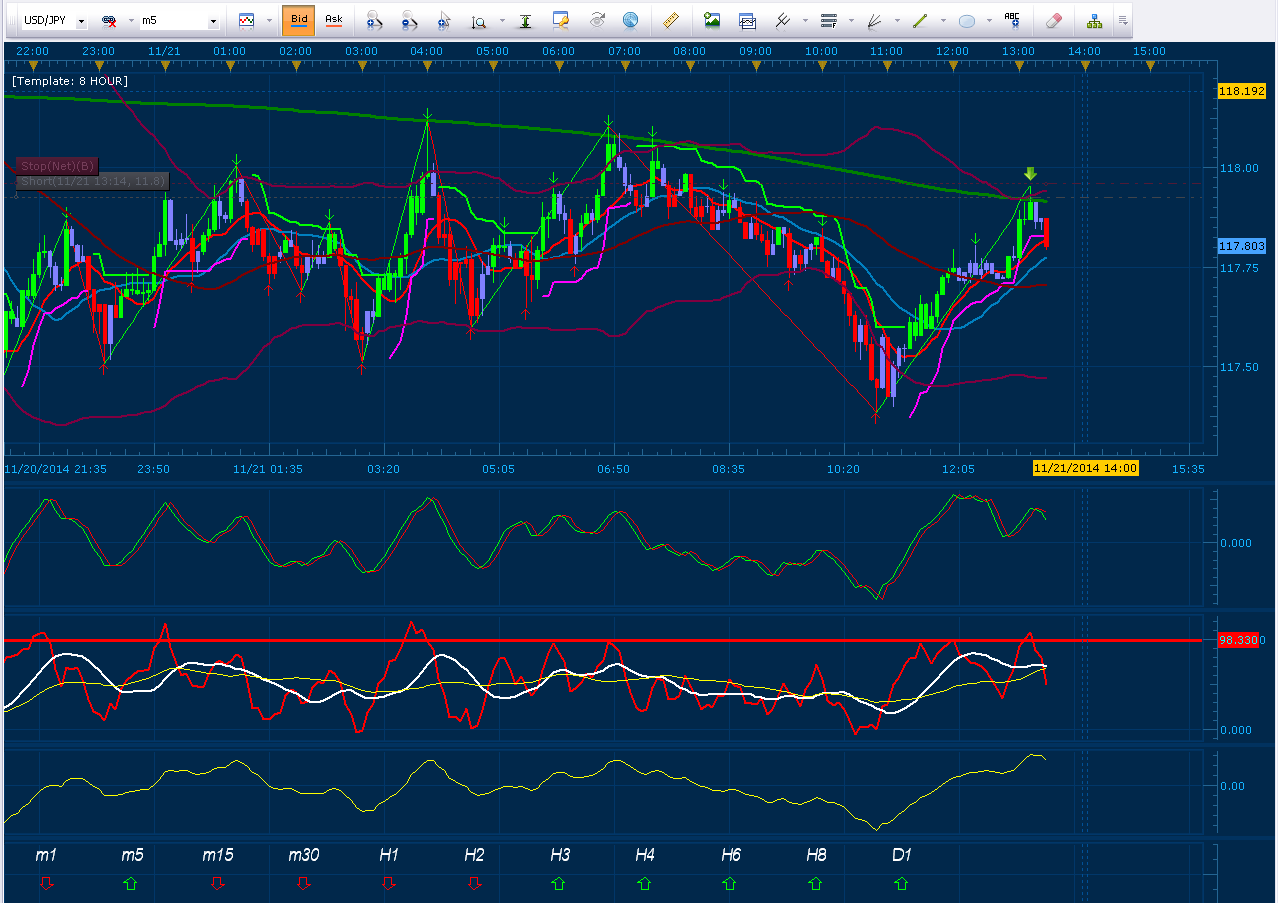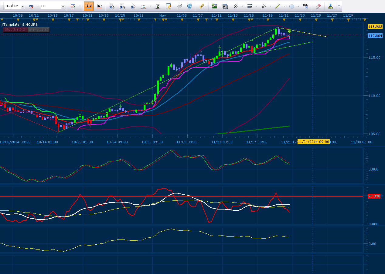 This is right at bullish continuation support, which is where I swing trade it long for trend trades. That makes this pretty sketchy, so I am using the 5 minute chart just to see what is up. Here is the 8 hour bullish trend continuation support chart: