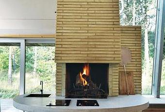 A hearth is the heart of a home, even in a summer getaway. In this open-plan house in Denmark, life revolves around a towering brick chimney, which holds three fireplaces, a conventional oven, and a pizza oven.