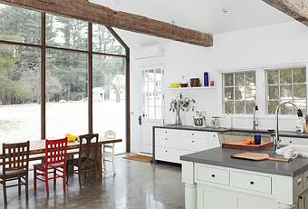 By combining reclaimed materials with modern elements, architect Tom Givone was able to "bring the vernacular past into the present." While renovating this former farmhouse in Eldred, New York, Givone discovered the wooden beams that now accent his kitchen in a crumbling Pennsylvania barn, and gave them a second chance. Photo by Mark Mahaney.