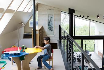 The loft above the living room is Suresh's terrain, given over to toys, books, and a colorful Lego table. The Clerestory windows maximize the natural light in the house—essential since there are only three hours of sun on a typical winter day.