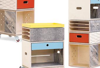 Trolley Filing Cabinet by Jan en RandoaldA graphic design duo from Ghent rigged up a modular filing system that circles back to their print work: Some components of the rolling trolley are printed with patterned veneers while others are left in their natural plywood state. $1,679