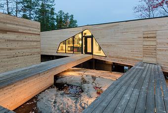 On Rainy Lake in Ontario, a cedar-clad cottage extends almost naturally from an outcrop of volcanic rock. Like organisms that have adapted to a harsh climate, the home’s two volumes bend with the glacier-formed ridge, their steel foundation bolted firmly to the basalt.