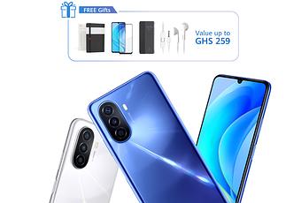 HUAWEI nova Y70 comes in three colours: Pearl White[1], Crystal Blue, and Midnight Black. Pre-order now via either the Official Consumer Website, Huawei Experience Store Accra Mall, or our Accredited retail stores before 26th June, 2022 for GHS1,379 and get gifts valued at GHS259