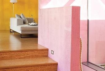 Cozy cork flooring neutralizes the bright colors of the walls in this Los Angeles home. Photo by Lisa Romerein