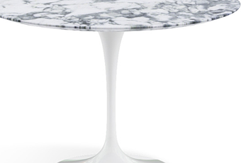 Part of the Pedestal collection introduced by Eero Saarinen as an answer to "the ugly, confusing, unrestful world" that lay beneath the surfaces of chairs and tables, this 42" round dining table comes in both Arabescato marble (shiny or matte finish), and a white laminate.