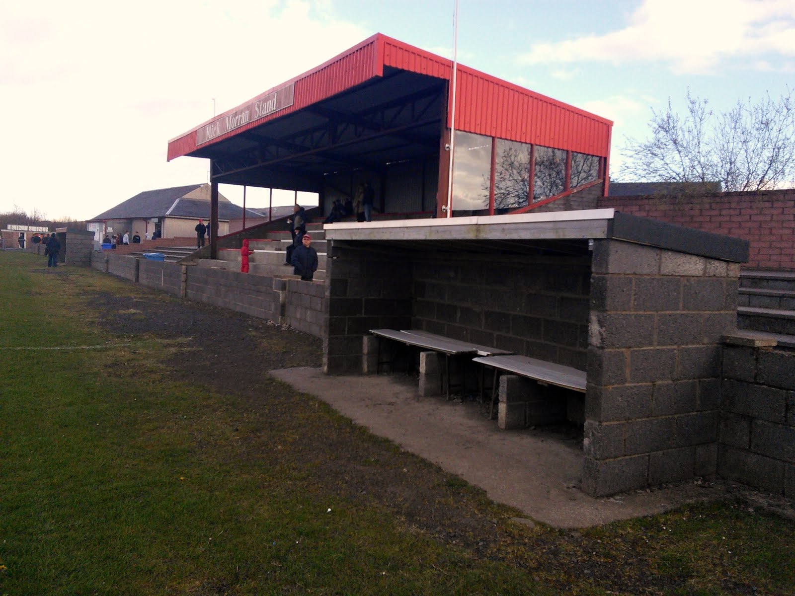 (Scottish grounds visited 72 Junior grounds 26 Lifetime Junior Cup winners 19/27)After 30 years playing on the colliery pitch at Connel Park, Glenafton Athletic moved to Loch Park in 1960, and at the same time changed the club colours from black and white to red. The ground has a 250 capacity covered stand on one side, filled with bench seats and named in honor of Mick Morran, the club’s late physio. At each side of the stand there is plenty of terracing, with the rest of the ground open with sleeper terracing and grass banking, including the strange site of the TV gantry being used as some kind of dog pen. There’s a clubhouse bar in the Hugh Campbell Hall, named after the former club president, next to the snack bar on one side. The changing rooms are behind the goal in the Hunter Pavilion, which has a trophy room and hospitality upstairs. The club have revealed plans for a new changing facility and an all weather playing surface.