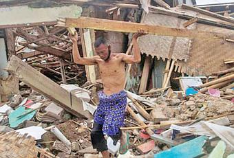 A man salvages wood after the earthquake that struck Cianjur, in West Java province.