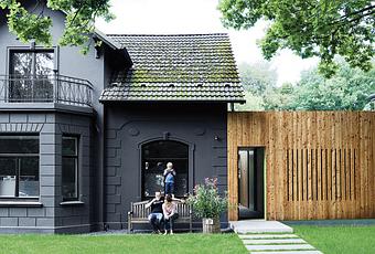 A family of cost-conscious Hamburgers converted a kitschy turn-of-the-century villa into a high-design home with a strict budget in place. To unite the quaint masonry of the original villa with the squat, ugly add-on built flush against it, the architects decided to paint the old-fashioned facade graphite gray and then covered the box next door in plain, light-colored larch.