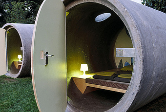 Das Park Hotel in Ottensheim, Austria has made hotel rooms out of retired concrete drainage pipes. After receiving a coat of varnish, a skylight, and a colorful paint job on the back wall, these pipes are ready for occupants.