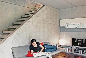At the bottom of the stairs in this concrete home in Switzerland is a second living space that includes a fireplace. The couple couldn't find a television that didn't clutter the cool minimalism so they prefer to use a projector to watch movies. The sofa was designed by Barber-Osgerby for Cappellini, and the Djinn chair is by Olivier Morgue. Photo by Hertha Hurnaus.