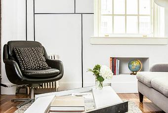 This Manhattan apartment features a one-of-a-kind coffee table: a parallelogram-shaped window pane, rescued from an architectural salvage yard, was outfitted with steel edges and casters, and repurposed as a coffee table.