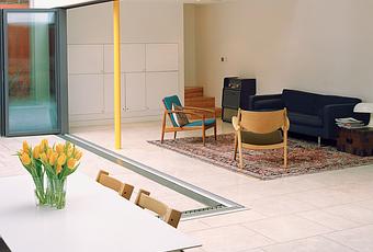 The glass wall separating the main living area and the inner courtyard garden at this geothermal cottage opens like an accordion to create a barrier-free transition. Built-in planters along the walls of the courtyard add greenery without eating into the valuable surface area of the courtyard.