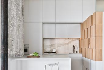 This Brooklyn loft is marked by careful coordination of color. In the kitchen, the gray and white marble backsplash, lit with faint orange lights, mediates between the ashen column and ochre cabinets.