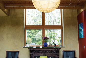 The railing of an open upstairs hallway in a zero-energy Santa Cruz house is another application of collected driftwood in the home.