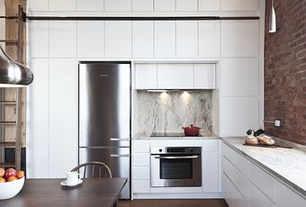 A smart built-in unit conceals a fridge, stove, oven, and cabinetry in this 850-square-foot Montreal apartment.