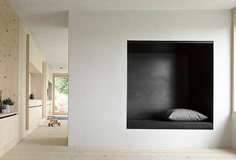 Architect Sven Matt mixed basic shapes with rich details in this Austrian home. Plaster walls mixed with gray marble powder dominate the interior of the bottom floor, including this nook, complementing the ubiquitous spruce wood carpentry.