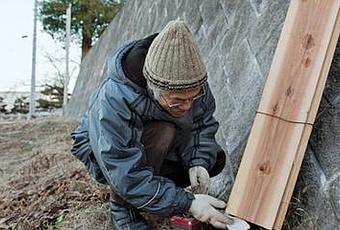 Fujimori, demonstrating the process of charring cedar boards, packs newspaper into the base of three planks that have been bound together. To begin the charring process, the newspaper that has been packed between the boards is set on fire.